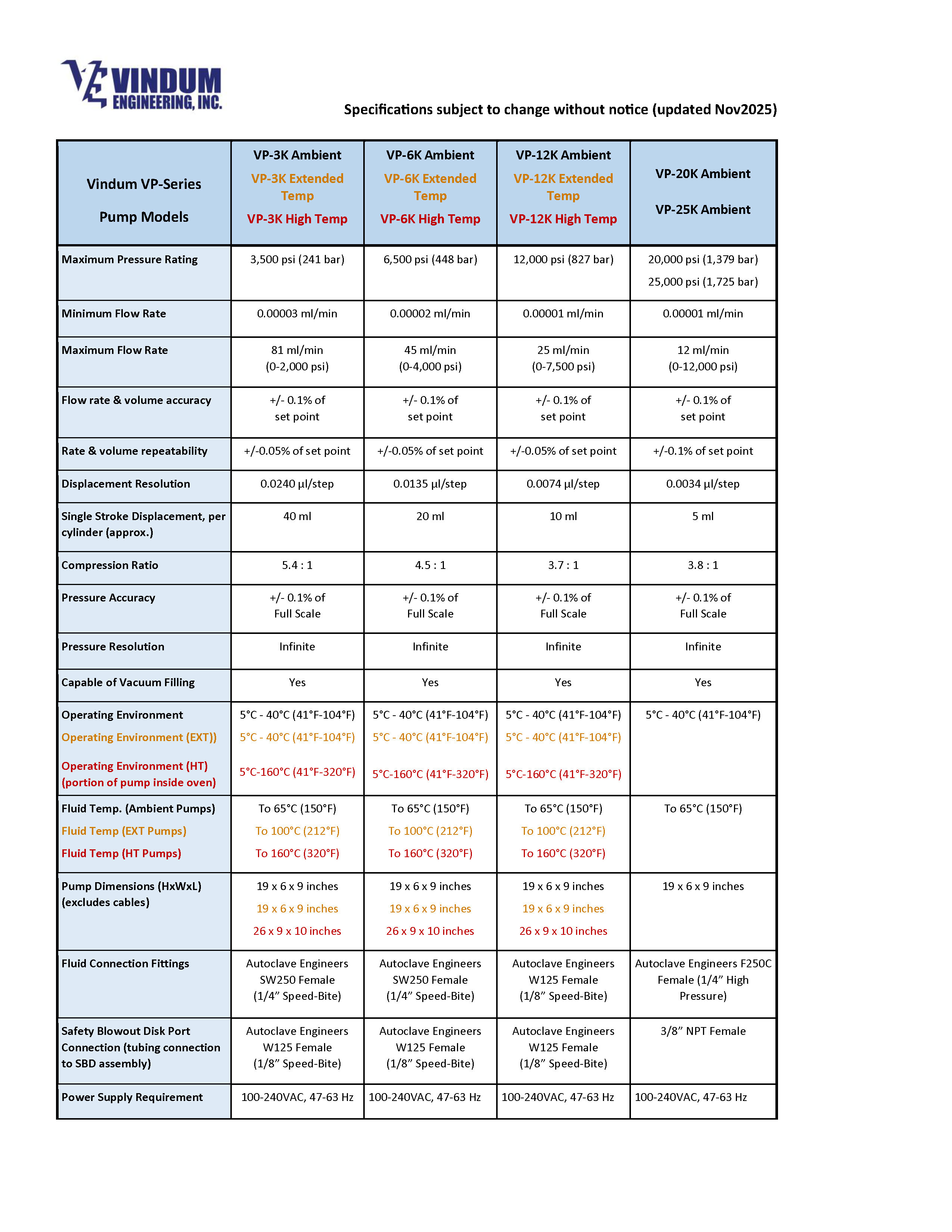 The VP-3K, VP-6K, and VP-12K pumps are available in either EXT or HT versions. If you would like additional details or specifications, you are encouraged to contact Vindum Engineering through the REQUEST A QUOTE button above. They will be very glad to assist you in finding the best solution for your high-temperature pumping needs.